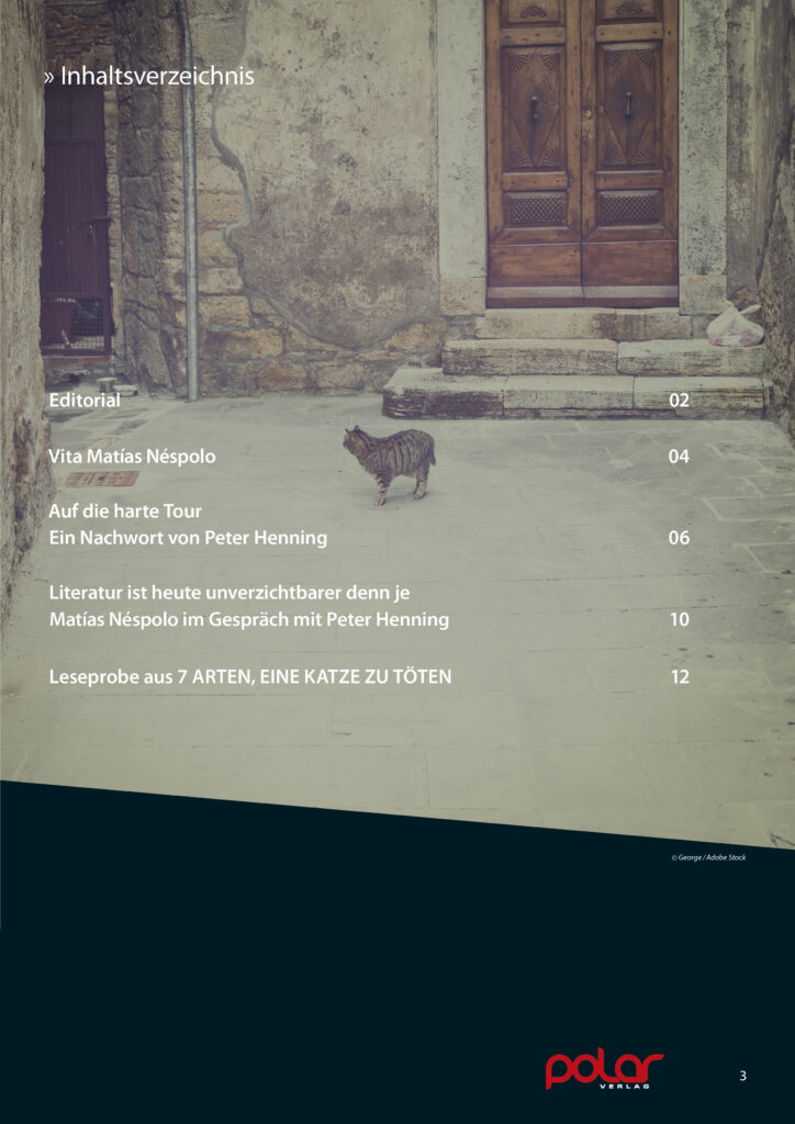In der Polar Gazette No. 26/02 stellen wir Ihnen Matías Néspolo mit dem Krimi „7 Arten eine Katze zu töten“, der am 16.02.26 erscheint, vor. In unserem Magazin finden Sie Porträts, Leseproben, Interviews mit Autoren und alles Wissenswerte rund um das Buch.
